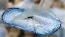 يمتاز هذا الحيوان بلونه الأزرق الغامق وهو لون القرص البيضاوي الذي لا يتجاوز طوله العشرة سنتمترات ويطفو على سطح الماء، أما الجزء الاخر منه فهي زعنفة نصف دائرية أعلى القرص تشكل ما يشبه الشراع، فهذه الحيوانات تعيش في حالة وسط ما بين الماء والهواء.