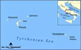 وتضم البلدية جزيرة سانتو ستيفانو الصغيرة التي تبعد كيلومترين (ميل واحد) إلى الشرق، وهي موقع سجن ضخم، وهو مغلق الآن. وهناك جزيرة أخرى تدعى بونزا وتقع 40 كم (25 ميل) إلى الغرب.