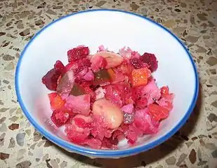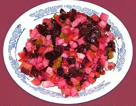 | المكونات الرئيسية | شمندر أحمر, بطاطا, جزر, بصل, ملفوف مخلل و/أوخيار مخلل |
