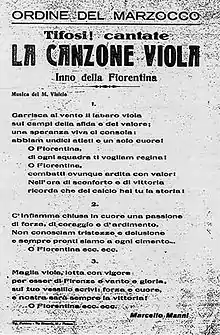 يُسمي نشيد فيورنتينا باسم "أغنية الفيولا" Canzone viola ومعروف أيضًا باسم "أوه فيورنتنيا" O Fiorentina قام "مارسيلو ماني" بكتابته عام 1930 ولحنه "ماركو فينيتشي". قامت الجماهير بطباعة النشيد وكلماته ووزعت العديد من النسخ على باقي مشجعي الفريق لكي يتمكنوا من حفظه وبذلك أصبح النشيد الرسمي لفيورنتينا. وفي عام 1964، قام "نارتشيزو باريدجي" بغناء النشيد من جديد مع إضافة بعد التعديلات على النص. أصبح هذا الإصدار الأخير النشيد الرسمي لفيورنتينا ومنذ هذا الوقت يقوم المشجعين بغنائه دائمًا قبل كل مباراة لتحفيز اللاعبين.