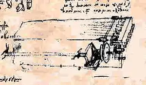 يُظهر تصميم ليوناردو أداة مربعة غامضة على شكل القيثارة مع عجلة مقوسة باليد ، وعدد غير محدد من الأوتار أو المفاتيح.