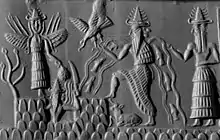 باد تيبيرا و كوارا و أكشاك.[112] | دوموزيد وعرف لاحقاً بإسم تموز، وقد عرف بكونه إله الرعاة،[112] زوجته كانت الإلهة إنانا.[112] وشقيقته هي الإلهة غشتينانا.[112][113] بالإضافة إلى كونه إله الرعاة، أعتبر دوموزيد إله الزراعة ونمو النباتات.[114][115] سكان بلاد النهرين القدماء ربطوا دوموزيد بفصل الربيع وربطوه بخصوبة الأرض ووفرتها،[114][116] وأثناء فصل الصيف كان يتم الاعتقاد بموت دوموزيد بسبب توقف خصوبة الأرض.[114][117] وخلال شهر تموز في وسط الصيف كان الناس يبكون على موته.[118][119] ذكرت قصص كثيرة في بلاد النهرين مرتبطة بموته في فصل الصيف.[118][119] |
