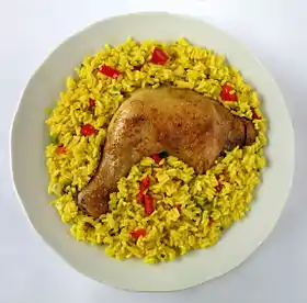إسبانيا | "أرز مع الدجاج، أصل هذا الطبق من إسبانيا وهو شكل من أشكال بيلاف وهو شائع في كافة دول أمريكا اللاتينية.[2][3][4][5][6] وهو طبق تقليدي في أمريكا اللاتينية والكاريبي، خاصة في كولومبيا وبورتوريكو وهندوراس وكوستاريكا وكوبا وبيرو وبنما والإكوادور وفنزويلا وجمهورية الدومينيكان. |