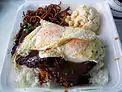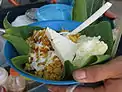 ماليزيا | أرز يطهى على بخار حليب جوز الهند يضاف له السمك والكاري ومكونات أخرى إضافية بشرائح البيض المسلوق المقلي وجوز الهند والخضراوات المخللة. |