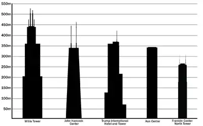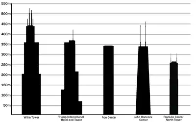 1,127 (344) | 100 | 1969 | 41°53′55.5″N 87°37′23″W | 8th-tallest building in the United States؛ tallest building constructed in the world in the 1960s; first building in the world outside of نيويورك to rise at least 1,000 قدم (305 م).[16][17] |