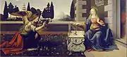 يحمل الملاك زنبق مادونا الذي يعتبر رمزاً لعذرية مريم ولمدينة فلورنسا أيضاً. ومن المفترض أن ليوناردو نسخ صورة أجنحة طائر في الجو عن تلك التي في الأصل ولكن لاحقاً تم تعديلها بواسطة فنان آخر.وعندما وصلت لوحة البشارة إلى معرض أوفيزي عام 1867، من دير سان بارتولوميو بالقرب من فلورنسا تم إنسابها وإرجاعها إلى دومنيكو غرلاندايو الذي كان مثل ليوناردو متدرباً في ورشة العمل الخاصة بأندريا دل فروكيو. في عام 1869 اعترف بعض النقاد على أنها عمل من أعمال مرحلة الشباب لليوناردو دي فينشي. | ||