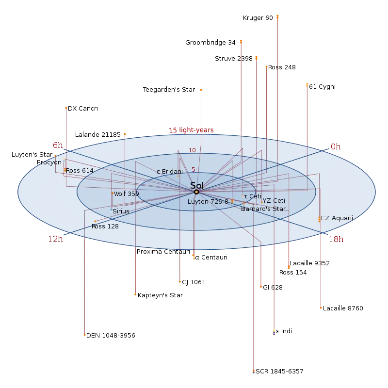 | وولف 359 (CN Leonis) | وولف 359 (CN Leonis) | M6.0V | 13,54 | 16,55 | 10h 56m 28s | +07° 00′ 42″ | 0,419″ | 7,78 | Y |