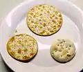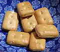 الخبز المقرمش | مخبوز يصنع من الحبوب والدقيق ويصنع غالباً بكميات كبيرة. يكون البسكويت الرقيق (يقابل البسكويت المالح في المملكة المتحدة وجزيرة مان) مسطّحاً وهشاً وصغير الحجم عادةً (قطرها 3 إنشات تقريباً أو أقل) ويصنع بأشكال مختلفة غالباً ما تكون دائرية أو مربعة. | |