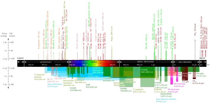 | ليزر بخار السترونشيوم [الإنجليزية] | 430.5nm | يستخدم في:
