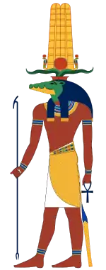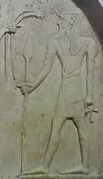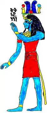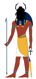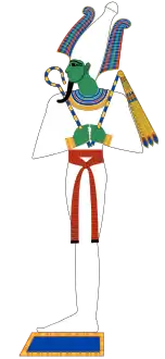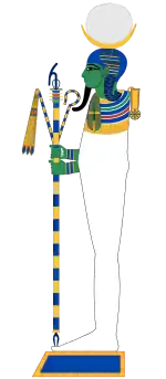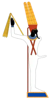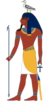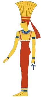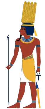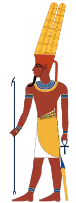 من أقدم الآلهة المصرية | على هيئة رجل منتصب يلبس رداء ضيقاً ويرفع أحد ذراعيه إلى أعلى لتحمل السوط بينما تختفي اليد الأخرى تحت ردائه، ويحمل فوق رأسه تاجان ذو ريشتان | ![]() | |||||||||