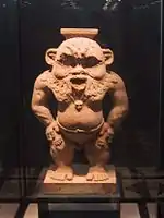 على هيئة قزم ذو سيقان مقوسة ووجه مريع ولبدة أسد وأحياناً يلبس تاج من الريش العالي |