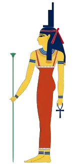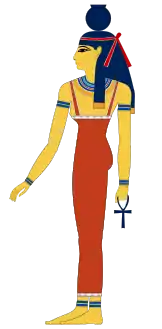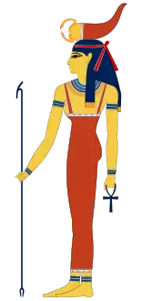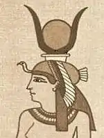 تمثل على هيئة امرأة تحمل تاج عبارة عن قرنين بينهما قرص الشمس أو بقرة أو لبؤة أو ثعبان أو شجرة. |