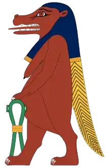 يعني العظيمة تحمي الأمهات أثناء الحمل والولادة | على هيئة أنثى فرس النهر بصدر أنثوي ضخم، ومخالب أسد وذيل التمساح | ![]() | |||||||||