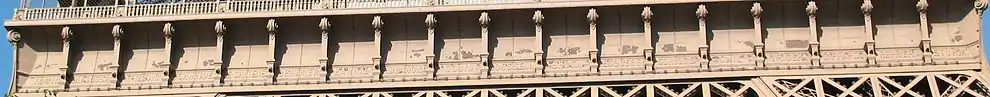 هذه الأسماء كتبت بأحرف من ذهب سمكها 60 سم، في أعلى الطابق الأول. تم طلائهم في بداية القرن العشرين، قبل أن يعاد استعادتهم في 1986 و1987 من قبل شركة استغلال برج إيفل.