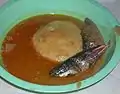 غانا | A غذاء رئيسي similar to a خبز عجينة متخمرة دامبلنغ from the Akan، Ga and Ewe inhabited regions of غرب أفريقيا, usually served with a soup, stew, or صلصة. |