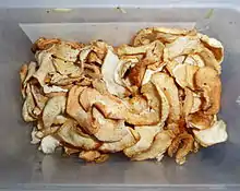 - تفاح مجفف - يمكن أكله مجففاً أو بتغطيسه في السوائل كالماء أو المشروبات الكحولية.