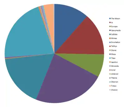 والأقمار السبعة التي هي أكبر من أي من الكواكب القزمة المعروفة؛ بالخط الغامق والمائل.