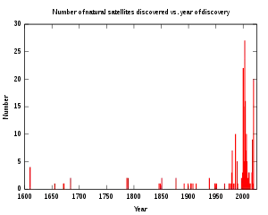 الاكتشافات الأولى للأقمار الطبيعية تمت من قبل غاليليو غاليلي وهي تسمى أقمار غاليليو الأربعة التابعة لكوكب المشتري، اكتشفها في يناير عام 1610 للميلاد. وعلى مر القرون الثلاثة التالية لم يتم اكتشاف سوى عدد قليل من الأقمار. البعثات إلى الكواكب الأخرى في عام 1970، وأبرزها فوياجر 1 و 2 شهدت زيادة في عدد الأقمار المكتشفة، وعمليات الرصد منذ عام 2000، وذلك باستخدام التلسكوبات الأرضية البصرية الكبيرة في الغالب، اكتشفت الكثير من الأقمار وكلها أقمار غير منتظمة.