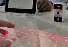 - لوحة المفاتيح المسقطة - يتم عرض لوحة المفاتيح الافتراضية على الحائط أو سطح الطاولة وتسمح لكتابة أجهزة الكمبيوتر المحمولة والهواتف المحمولة. تم تطويره في وقت واحد من قبل شركة Lumio الإسرائيلية وشركة Canesta الناشئة في وادي السيليكون.[33][34][35][36] قامت الشركة في وقت لاحق بترخيص التكنولوجيا لشركة Celluon of Korea.[37]