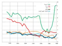 رسم بياني يوضح أكبر خمس دول في تصدير النفط الخام بين عامي 1980-2012.