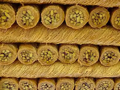 القطر نضع الماء على النار في وعاء غميق من ثم يتم إضافة السكر ويتم التحريك حتى يذوب السكر ويترك على النار حتى يغلي. نضيق عصير الليمون بعد ذلك ومن بعدها نضيف الشبة. نتركه على النار لمدة عشر دقائق حتى يصبح كثيفاً. يترك بدرجة حرارة لمطبخ حتى يبرد.[30] الحشو نحضر الفستق الحلبي من ثم يتم وضعه في وعاء عميق، من ثم يتم إضافة مقدار كأس من القطر البارد عليه بحيث يغمره جيداً. نقلّبه جيداً مع القطر، من ثم نحضر صينية مفرودة خاصة في الفرن وندهنها بالقليل من السمن أو الزيت ويتم وضع الفستق الحلبي مع القطر داخل الفرن المسخن من قبل على درجة حرارة عالية، نضع صينية الفستق الحلبي بالرف المتوسط ويترك حتى يتحمر قليلاً وتلتصق حبات الفستق مع بعضها البعض.[31] العجينة نحضر صينية من ثم نقوم بدهنها بالقليل من السمن أو الزبدة، بعد ذلك نحضر كمية من لكنافة ويتم لفّها على شكل أعشاش صغيرة بواسطة الأصابع ليتكوّن لدينا عش صغير ويمكن أن نتحكّم في الحجم حسب الرغبة. ترصّ الأعشاش بصينية الفرن من ثم يتم وضح حبات من الفستق الحلبي داخل كل عش من ثم نسكب السمن المذاب الدافئ عليها بحذر من جميع الإتجاهات من ثم ندخلها إلى الفرن حتى تتحمر ويصبح لونها ذهبي وتحتاج من 20 إلى 30 دقيقة حتى تتحمر. نخرج الصينية من الفرن ويتم تصفية الزائد من السمن مع الانتباه من أن تفسد الأعشاش. نحضر القطر البارد مباشرةً وهي ساخنة من ثم نسكبه على كل قطعة من الحلوى.[32] |