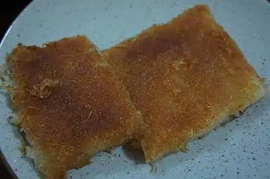 نصف كيلو جبن حلو للحلويّات جبن حلوم، أو قشطة، أو جوز حسب الرغبة. كوب سمن عربيّ، أو نباتيّ حسب الرغبة. نصف كوب فستق حلبي مجروش. قطر للتحلية.[33] |