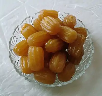 | بلح الشام | من الحلويّات العربيّة الشعبيّة التقليديّة التي اشتهرت في سوريا، وسميت بهذا الاسم لأنّها تشبه حبّة البلح، وتتميّز بمذاقها الحلو جدّاَ واحتوائها على نسبة عالية من السعرات الحراريّة، وبالرغم من ذلك مرغوب بها من قبل الجميع كباراً وصغاراً، وانتشرت في جميع الدول العربيّة ممّا زاد الطلب عليها بشكل أكبر. |
