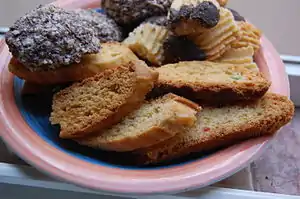 ![]() | غريبة النخالة [31][32] | "غريبة النخالة" أو "حلوى النخالة" هي حلوى دائرية الشكل، سهلة التحضير صحية ولذيذة في نفس الوقت، حيث تضم عنصر لبنخالة أو الردة وهي الطبقة الخارجية الصلبة من الحبوب، وهذا ما يحعلها تضم مكونا غذائيا رئيسيا وصحيا. وتقدم في غالب الأحيان مع الشاي الساخن أو القهوة | نخالة والزنجلان والسكر والخميرة و"الفاني" ثم يضاف إلى خذه المكونات البيض والزيت.[33][34] ويشار إلى أنها تختلف عن الغريبة الشامية. |