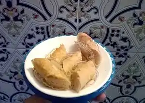 ![]() | بريوات | البريوات هو طبق من المطبخ المغربي[10] يمكن إعداده على عدة أنواع، بين المقبلان والحلويات أو كطبق يقدم كوجبة دسمة، ينتمي لعائلة الفطائر، الذي يحضر بورق البسطيلة يصنع من (عجين رقيق للغاية يصنع من الدقيق والماء والملح)، والنوع الذي يهمنا في هذه القائمة هو بريوات بالجوز والأرز المعسلين.[11] | 200 غ من الجوز المفروم - 100 غ من الزبدة - 100 غ من السكر الناعم - عسل - ماء الزهر - ورق البسطيلة. يمكن إضافة 120 من الأرز الأبيض وقرفة (دارسين) إذا كانت بسطيلة من الأرز والجوز المعسلين.[11] |
