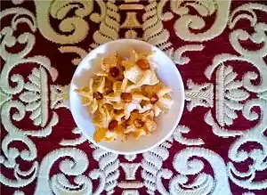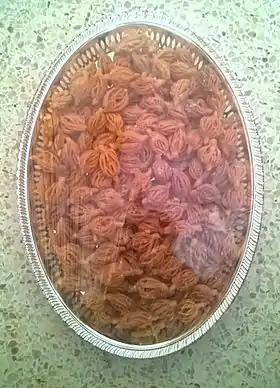 ![]() | الرزيزة[54] أو رزة القاضي [55] وتعرف أيضا خارج المغرب بالرزيزة المغربية،[56] | يمكن وصفها بالحلوى الفطيرة، فهي تجمع بين الإثنين وتشبه قليلا المسمن المغربي من حيث الشكل العام.هي في الأصل اختصاص بدوي ريفي. حلوى لذيذة منقوعة بالعسل، وقد سميت برزة القاضي لأنها تشبه الرزة أو العمامة من خلال خيوط تبدو وكأنها منسوجة، وهي مصنوعة من الدقيق الرطب لتتحول إلى خيوط رفيعة منسوجة بالزبدة، وكأنها خيوط كبّة، تُشَكّل بشكل دائري، على صورة الرزة الصفراء التقليدية، المعروفة في بعض المناطق المغربية والجزائرية، التي سميت عليها (تشبيها).[57] | 1 كيلو دقيق أبيض، دقيق القمح،
