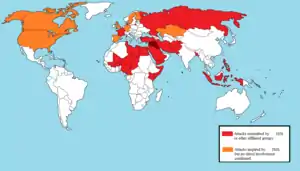 منذ حزيران (يونيو) 2014 عندما أعلن تنظيم داعش عن تأسيس ما أسماه دولة الخلافة ووفقًا لإحصاء مستمر تحتفظ به سي إن إن [بحاجة لمصدر] ، فقد "نفذ أو حرض" على أكثر من 70 هجومًا إرهابيًا في 20 دولة، بما في ذلك سوريا والعراق .