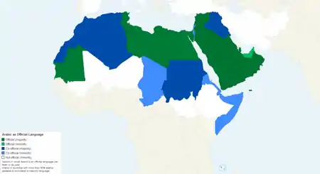 الأمم التي اللغة العربية هي اللغة الرسمية (بحكم الأمر الواقع أو بحكم القانون). اللغة العربية في دولة بأكثر من 50٪ من الناطقين باللغة العربية تعدّ لغة الأغلبية، وإلا فإنه هي لغة أقلية