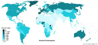 القائمة الآتية لمجمل استهلاك الكحول للفرد سنويا حسب البلد باللتر للكحول النقي والقائمة منشورة من منظمة الصحة العالمية لعام 2015.[3]