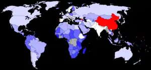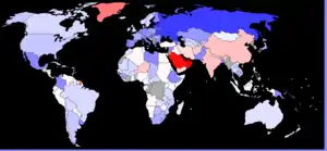 النسبة بين الجنسين لكل بلد حسب المجموع العالمي. الأزرق يمثل أكثرية الإناث, و الأحمر يمثل أكثرية الذكور حسب المتوسط العالمي البالغ 1.01 ذكور / إناث .