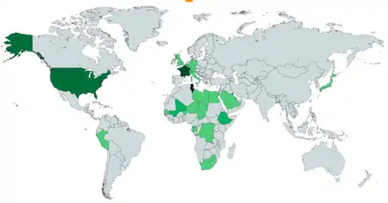 | ليبيا، مصر، بيرو، السنغال، مالطا، جمهورية الكونغو الديمقراطية، المملكة المتحدة، السعودية، ألمانيا، اليابان، جنوب أفريقيا، سويسرا، بلجيكا، النيجر، تشاد، الغابون، غينيا الاستوائية، إيطاليا، الفاتيكان. |