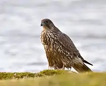 يعرف أيضا بالشَّاهِينُ البَحرِيُّ (الاسم العلمي: Falco rusticolus) من أضخم أنواع الصقور، يتوالد في السواحل الشمالية من الكرة الأرضية، كما أن التجوال الفردي أو التشرد الفردي (Individual vagrancy) يأخذ هذه الطيور لمسافات بعيدة. يختلف لون ريشها باختلاف مكان إقامتها. |