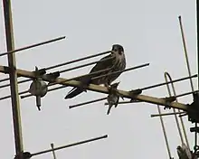 صقر الخفاش (الإسم العلمي: Falco rufigularis) ) هو صقر يستوطن منطاق في المكسيك الاستوائية وأمريكا الوسطى والجنوبية وترينيداد.إناث صقور الخفافيش يبلغ طولها 30.5 سم، أكبر بكثير من طول الذكور البالغ 23 سم. صقور الخفاش البالغة ذات ريش أسواد اللون على ظهر والرأس والذيل. |