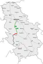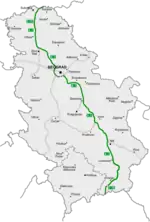 شمال جنوب، E75، طريق بلغراد | -Horgoš - سوبتيتسا - فرباس (مدينة) - نوفي ساد - بيشكا - Batajnica - بلغراد - Surčin - ياغودينا - Paraćin - Pojate - ألكسيناتش - Trupale - نيش - Merošina - ليسكوفاتس - فلاديتشين هان - فرانيي - بويانوفاتس - Preševo - شمال مقدونيا. | 1977 - 2021 | 584 km |