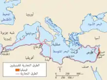 كان الفينيقيون قوة كبيرة حول المتوسط بين 1200 ق.م و539 ق.م.[8] كانت الحضارة البحرية السامية متمركزة على الساحل الغربي للهلال الخصيب وتمركزت على ساحل لبنان الحديثة. كانت كل المدن الفينيقية الكبيرة على ساحل البحر المتوسط ووصلت بعض المستعمرات إلى غرب المتوسط. كان الفينيقيون شعبا تجاريا بحريا محبا للمغامرة والذي انتشر على طول ساحل المتوسط من 1550 ق.م إلى 300 ق.م. استخدم الفينيقيون القادس، وهي سفينة يحركها البشر كما يرجع إليهم اختراع السفينة الحربية.[9] اشتهر الفينيقيون كثيرا في اليونان الكلاسيكية وروما باسم "التجار الأرجوانيين" مشيرين إلى احتكارهم للصبغة الأرجوانية القيمة من حلزون المريل والذي يستخدم في صبغة الملابس الملكية، كما اشتهروا بانتشار أبجديتهم والتي أتى منها تقريبا كل الأبجديات الحديثة.
