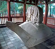 20 ديسمبر 1962 | بُني في بداية عهد مملكة شلا عام 661. كان موجودًا أمام قبر الملك ميول ( ملك شلا التاسع والعشرون). هذا الشاهد هو الأول من نوعه الذي عُرض بهذا الأسلوب، في الوقت الحاضر لا يُعرف عن مكان وجود بقية جسم هذا الشاهد، فهو فقط يضم قاعدة على شكل السلحفاة.[34] |