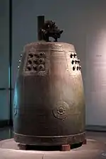 جرس سانغوونسا | 20 ديسمبر 1962 | هو جرسٌ مصنوع من النحاس، كان قد تمَّ صبُّه في عام 725 وهي السنة 24 من تسلُّم الملك سونغدوك للحكم خلال فترة مملكة شلا. يتراوح طوله 1.67 مترًا (5.47 قدم) وقُطرُه 0.91 بوصة. معلاق الجرس محفور على شكل رأس تنين كبير ذو مخالب قوية، بينما مُزيَّنٌ أنبوبه المجوف الذي يتحكم بالصوت برسمٍ لزهور اللوتس والكروم..[43] | ||