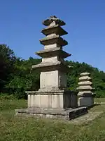 باغودا طبقات الصخر الثلاث في سلجونغري | مقاطعة غيونغسانغ الجنوبية | 20 ديسمبر 1962 | باغودا الشرق مكونة من 3 طبقات حجرية من فترة مملكة شلا في عهد جنهنغ. يتراوح طوله 5.1 مترًا وكل طبقة مُزينة ركائزها وزواياها الداخلية مُزينة بنقوش.[39][40] | |