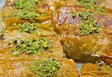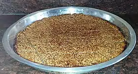 طبقتين من عجينة الكبة (برغل مطحون مع لحم الضأن) بينهما طبقة من اللحم والبصل واللوز أو الصنوبر، تمد على صينية، وتشوى في الفرن. | الجليل |