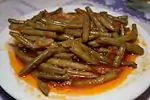 تقطع الفاصوليا الخضراء، وتطبخ مع صوص البندورة واللحم، وتقدم بجانب الأرز الأبيض. | |