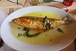 سمك مشوي بالفرن، يقدم مع صوص الطرطور؛ وهو عبارة عن طحينية وثوم وعصير ليمون وملح وبقدونس وقليل من الماء . | قطاع غزة والمدن الساحلية |