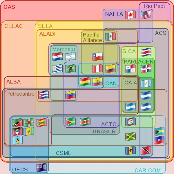 رسم أويلر البياني قابل للضغط على محتوياته يظهر العلاقة بين دول الأمريكيتين والمنظمات متعددة الجنسيات في القارتين.ع • ن • ت