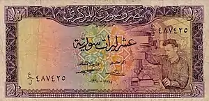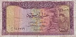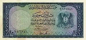 العملة الرسمية في الجمهورية العربية السورية هي الليرة السورية، وهي مُقسَّمة إلى 100 قرش، في حقبة الانتداب أشرف البنك السوري على عملية إصدار النقد، وتغيير اسم المصرف خلال تلك الحقبة ليصبح بنك سورية ولبنان.[1] وبعد الجلاء، استمر إشراف مصرف سورية ولبنان على إصدار النقد في البلدين، ثم حلَّت محله مؤسسة إصدار النقد السورية. ولكن، ومنذ عام 1956م، فإن إصدار النقد هو مهمة يشرف عليها مصرف سوريا المركزي.[2] صدر من الأوراق النقدية السورية الفئات التالية: قرش وخمسة قروش وعشرة قروش وخمس وعشرون قرشاً وخمسون قرشاً وليرة وخمس ليرات وعشر ليرات وخمسٌ وعشرون ليرة وخمسون ليرة ومئة ليرة ومئتا ليرة وخمسمائة ليرة وألف ليرة وألفا ليرة وخمسة آلاف ليرة.