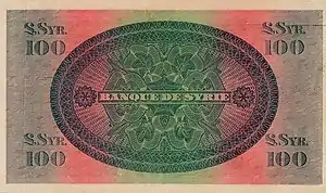 الألوان: الكتابة: البنك السوري (بالفرنسية: BANQUE DE SYRIE)