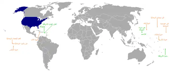 بالإضافة إلى 50 ولاية والمقاطعات الفدرالية، تسيطر الولايات المتحدة على أربعة عشر إقليما. خمسة منهم (ساموا الأمريكية، وغوام، وجزر ماريانا الشمالية، وبورتوريكو، وجزر فيرجن الأمريكية) وهم عبارة عن جزر بعيدة عن الولايات المتحدة البعيدة . باستثناء جزيرة نافاسا، وبورتوريكو، وجزر فيرجن الأمريكية، والتي تقع في منطقة البحر الكاريبي، وتقع الجزيرة بالاميرا في المحيط الهادئ . لهذه الأقاليم قانون أساسي تم سنه من الكونغرس . تتمتع كلها بحكم ذاتي محدود بالإضافة إلى وجود المجالس التشريعية الإقليمية والمحافظين، ولكن لا يمكن للمقيمين فيها التصويت في الانتخابات الأمريكية.