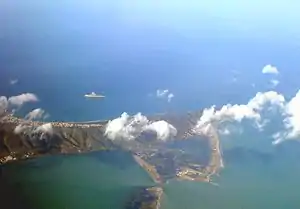 صورة جوية تظهر رأس الطرف وبحيرة غار الملح (على اليسار في الأسفل) وسبخة سيدي علي المكي (في الوسط)